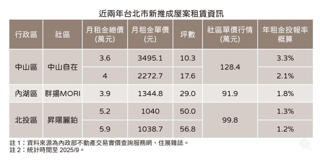 推算這些住宅的租金報酬率,「中山自在」兩揭露戶的投報率為3.3%與2.1%,出於市區小宅特性,生活機能無虞,租金單價稍高亦能受租客青睞,新案屋況佳也有所加分,且林森商圈本為租屋市場大本營,有利置產收租發展。