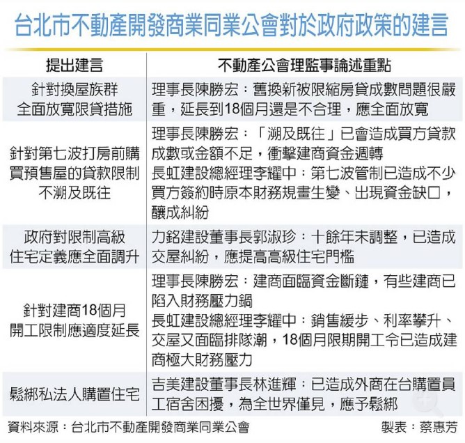 陳勝宏說,現在不論消費者房貸或建商土建融都還是難以取得貸款,就連財務體質較強的建商,也面臨財務壓力鍋的考驗,建請中央銀行鬆綁第七波不動產信用管制,去年第七波不動產管制之前已簽約購屋者應不溯既往。