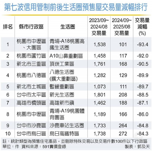 中央銀行去年9月推出第七波信用管制一年來,造成全台預售屋市場交易急凍。據591統計,打炒房前後一年各生活圈的預售屋交易量變化,不少區域僅剩約1成,其中以桃園青埔A18高鐵生活圈減少93.4%最高,桃園A10山鼻、三重頂崁工業區縮減均逾9成,前十大量縮區幾乎多為重劃區,其中又以桃園、台中等重劃區密集、過去建商推案熱絡的地區,交易量萎縮最為顯著。