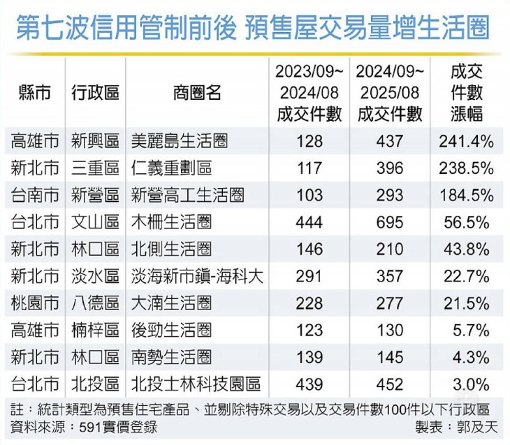 據591統計,在去年9月央行第七波信用管制前、後一年的全台各生活圈預售屋交易量顯示,不少北部地區具未來發展潛力、房價相對都會核心較低的蛋白區、或重劃區精華地段較外圍的生活圈,相對平價誘因,在建商個案順銷、剛需買盤捧場下,預售屋交易量甚至不下於管制前。