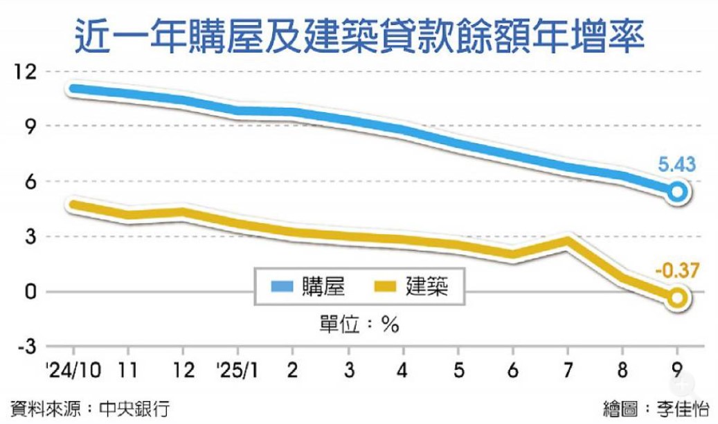 央行及各部會房市管制持續發酵,房市仍是「量縮、價盤整」格局,房市買氣延續低迷氣氛。中央銀行27日公布9月消費者貸款與建築貸款餘額,其中,房貸餘額雖續寫史上新高,但年增率僅剩5.43%,創下2023年9月以來的近26個月新低,且年增率已連12個月放緩。金管會27日公布,今年9月底國銀承做房貸餘額為11兆3,856億元,年增5.38%,年增率連12個月走降。