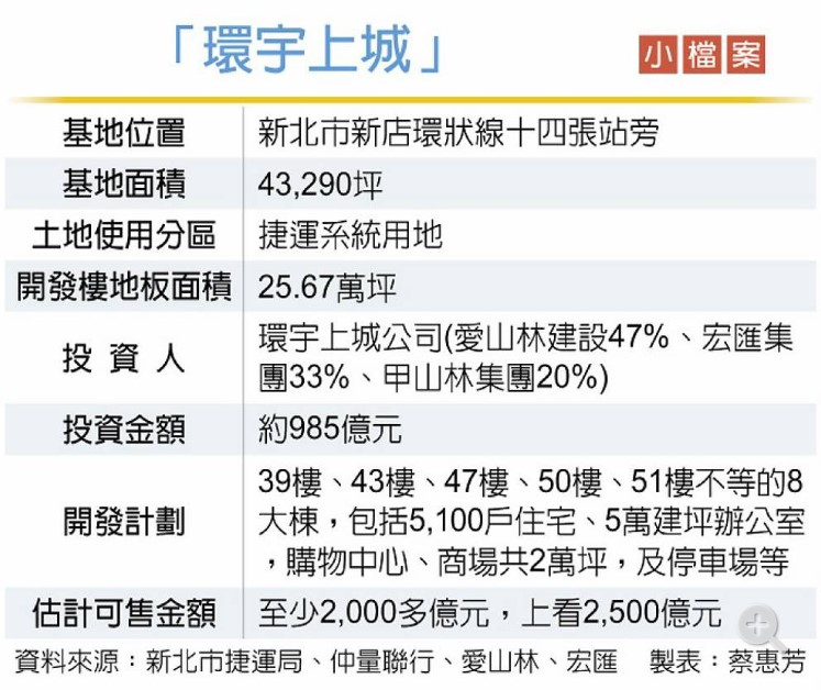 針對基地規模、投資金額最大的捷運聯開案「新北環狀線十四張站暨南機廠捷運開發案」,愛山林建設開發董事長祝文宇、宏匯集團董事長許崑泰27日宣布,將共同投資985億元,聯手開發25萬建坪共八大棟的微型i城市「環宇上城」,總銷金額逾2,000億元。