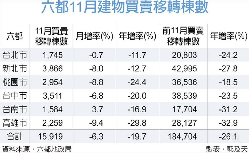 以前11月六都買賣移轉棟數來看,六都合計18.47萬棟、年減26.1%,創下近八年同期新低,也是自1999年有紀錄以來第四低,僅高於2015至2017年,六都中僅桃園衰退幅度在2成以內,南二都的台南、高雄均逾3成,台南續創近八年最低,台北、新北為近九年新低,高雄更是創下近十年來最低紀錄。
