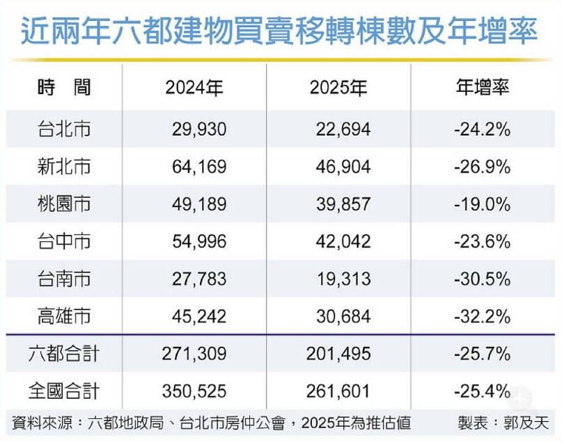 台北市房仲公會4日舉辦年終記者會,理事長蘇金城表示,預估全台全年房市交易量勉強守住26萬棟、量縮約26%,其中台北市預估約2.26萬棟,接近2016年的慘況。