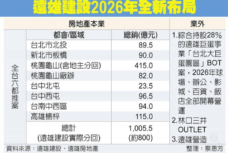 展望2026年的布局,遠雄建副總經理謝清林表示,遠雄建計畫推出8筆新案,包括台北市北投89.5億元、板橋90億元、龜山415億元、北屯23.5億元、西屯96.5億元、中西區94億元、楠梓案115億元、龜山廠辦案82億元,扣除地主分回後實際總銷金額達800億元,涵蓋六都。