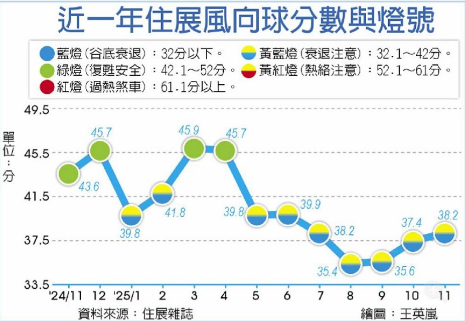 代表北台灣新建案市場概況的「住展風向球」,11月受到年底預售大案進場推升供給,但買氣並未同步提升,燈號仍維持衰退的黃藍燈。《住展雜誌》指出,年底新北市尚有數個百億元大案有機會推出,北台灣2025全年推案量有望低空飛過兆元關卡,但恐將是2018年以來的新低量。