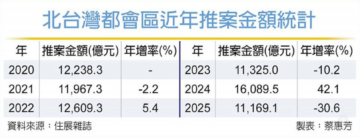 房市冷氣團罩頂,今年建商推案偃兵息鼓,所幸年底在數筆百億級大案紛紛搶推下,全年北台灣推案量勉強跨過兆元大關,達1.1兆元,但較去年大幅下修3成,為2020年以來最低量。展望2026年,專家預期政策可能不致於再加重打房,推測推案量應不再下探,有機會微幅回溫1成。