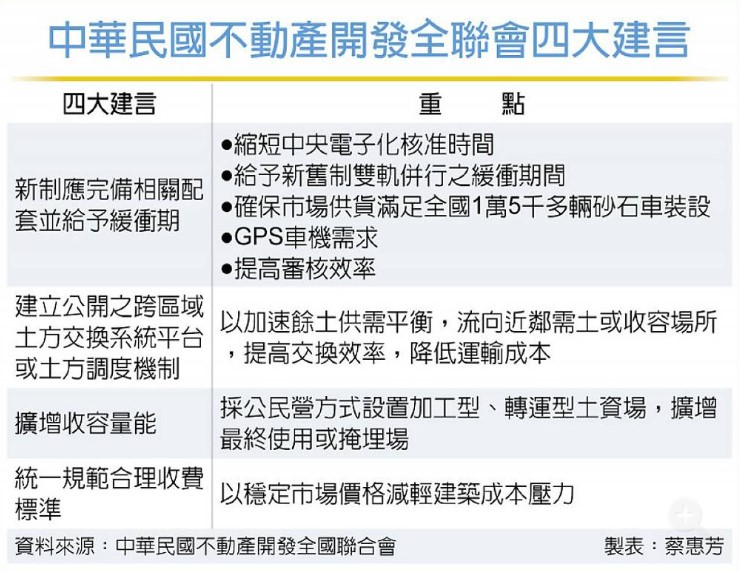中華民國不動產開發商業同業公會全國聯合會向政府提出四大建言,包括:新制應完備相關配套並給予緩衝期,建立公開之跨區域土方交換系統平台或土方調度機制,擴增收容量能,統一規範合理收費標準,以解決痛點。