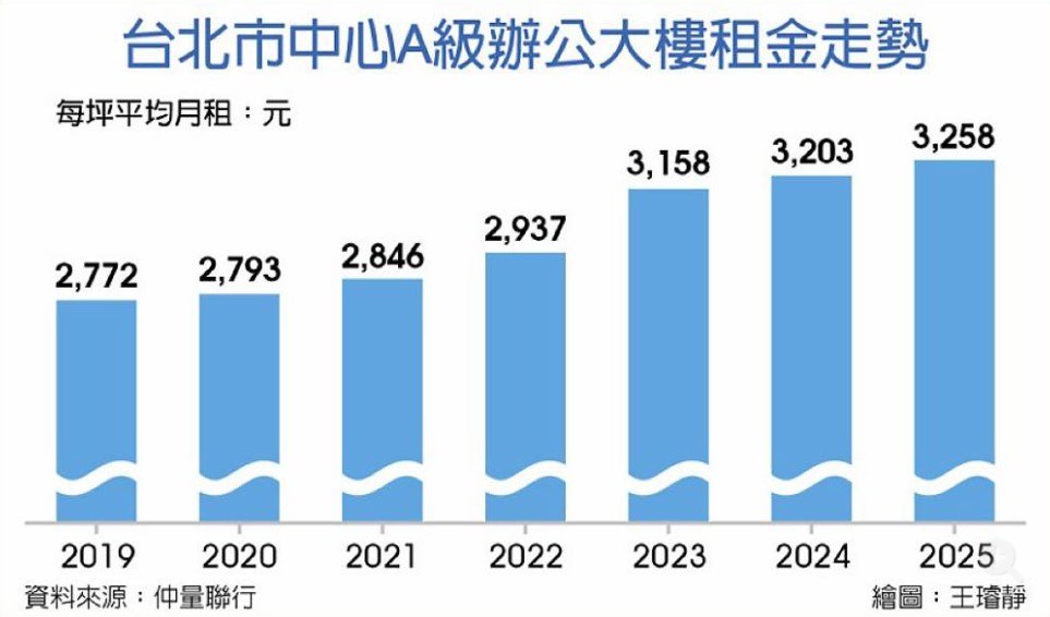 有「辦公租賃市場女王」之稱的仲量聯行商業不動產部副總經理游淑芬表示,依仲量聯行針對台北市90棟A辦大樓市場的最新調查數據,2025年辦公租賃市場延續2024年的多頭格局,表現亮眼,成交量已連續2年突破5萬坪,其中市中心成交4.4萬坪、每坪月租平均行情達3,258元,再創新高,年漲幅1.7%,南港每坪月租平均約2,367元,年漲2.42%。