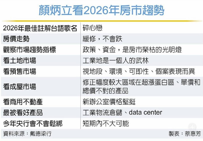 每年初顏炳立都會以一首台語歌的歌名,來註解未來一年的房市預期,從2013年迄今,都無一失準,顏炳立這次以「碎心戀」來形容2026年房市,對於市場碎、對於房價碎。