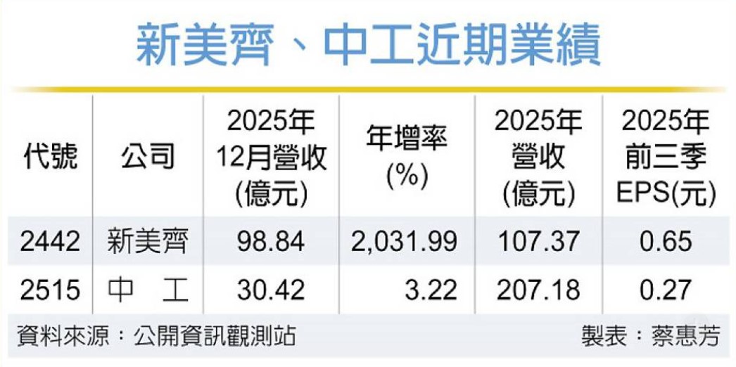 營建股殺出大黑馬,新美齊(2442)百億大案板橋「畫世代」趕在2025年底開始交屋入帳,推升12月營收噴出近百億元,創單月歷史新高,推升全年營收達107.37億元、年增8.81倍,再度創高,法人估該案對新美齊EPS(每股稅後純益)貢獻度高達7元以上,2025全年獲利可望大暴衝。