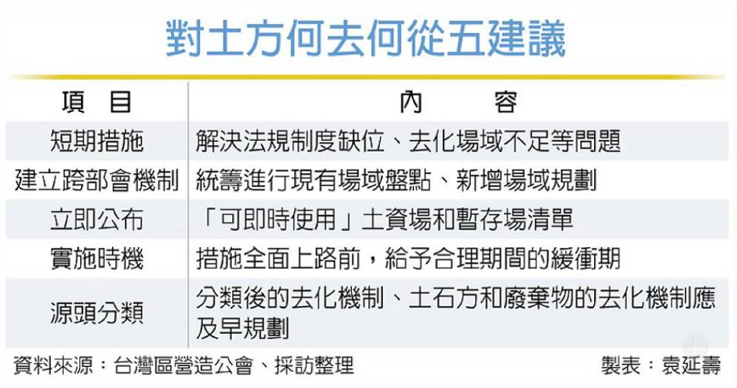 營造公會提出五大建議,一是以短期性措施為起點,累積資源和動能向長期性解決方案推動;二是建立跨部會機制,統籌進行現有場域的盤點和新增場域的規劃,加速補齊法規制度的缺位,包括釐清「營建剩餘土石方」、「營建廢棄物」乃至「混和物」的判定基準和執行機制。