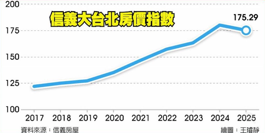 2025年12月信義大台北房價指數為175.29,月減0.97%、年減2.73%,創下自2024年7月近一年半以來的新低。信義房屋分析,雖然雙北房價不若雙北以外地區跌幅明顯,不過仍盤整微幅修正,未來若再連續二季走跌,即使是房價抗跌的雙北地區,也會面臨修正壓力。