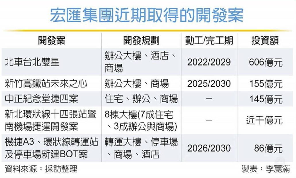 許崑泰指出,宏匯集團陸續在新北市投資開發頂級商辦大樓、凱悅嘉軒酒店與宏匯廣場,營運表現都不錯,其中宏匯廣場每年吸引超過600萬人次,並連續獲選為新北市熱門景點前三名;A3三重轉運站開發除興建轉運大樓,還規劃四星級酒店與宏匯廣場二期。此外,捷運十四張聯開案亦有30%規劃商辦,屆時是否要開出宏匯廣場三館,目前尚未定案。