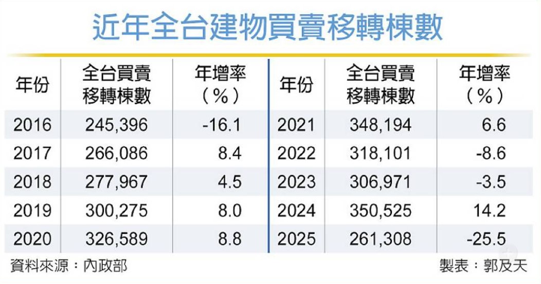 2025年全台買賣移轉棟數出爐,全年買賣移轉驚險守住26萬棟,為26.1萬棟,年減25.5%,劇烈衰退幅度為近年罕見,全年交易量寫下近九年新低及史上第三低紀錄,僅高於2016年房地合一稅上路的24.5萬棟,及2001年網路泡沫的25.9萬棟。