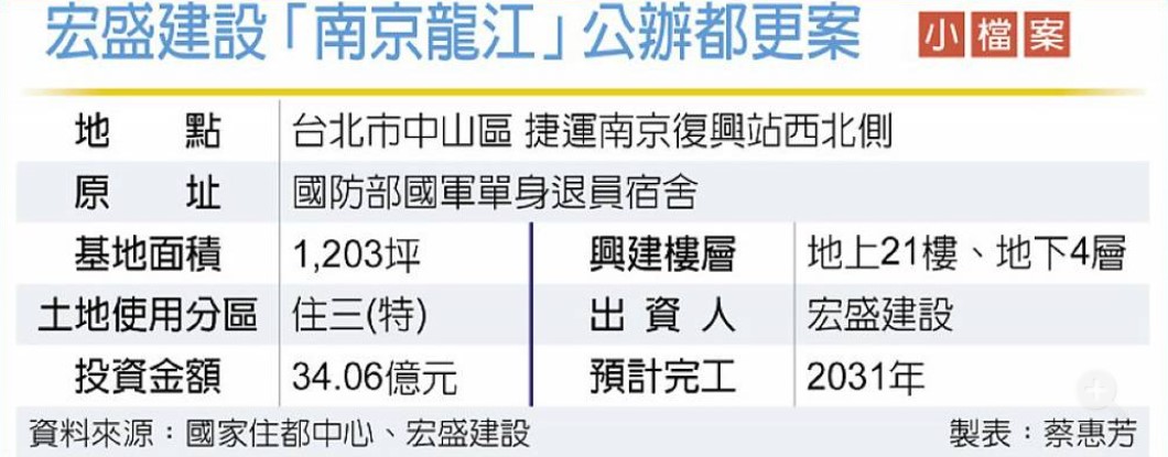以仁愛帝寶奠定豪宅建商一哥地位的宏盛建設,3日與國家住都中心完成台北市「南京龍江公辦都更案」簽約,全案投入約34.06億元,將興建1棟地上21樓、地下4層大樓,結合住宅、醫療、教育與商業機能,住都中心分回83戶將全數規劃為婚育宅,預計2031年完工。