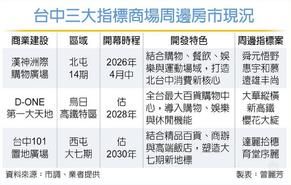 台中迎來三大百億級商業建設全面啟動,其中北台中「漢神洲際購物廣場」預計4月開幕,西屯區大七期「台中101」置地廣場、烏日高鐵特區「D-ONE第一大天地」工程進度同步推進,三大旗艦級商場齊頭並進,形成台中近年罕見的大型商圈集群效應,也為周邊住宅市場注入長線成長動能。