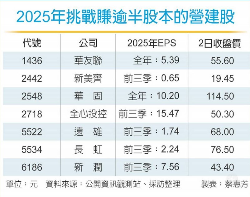 上市櫃建商紛紛迎接完工交屋潮,繼華友聯(1436)去年每股稅後純益(EPS)達5.39元,華固(2548)第12度大賺一股本後,市場預期全心投控(2718)將挑戰獲利1.5個股本,新美齊(2442)、遠雄(5522)、長虹(5534)、新潤(6186)等,去年都有望賺進至少半個股本的好成績。