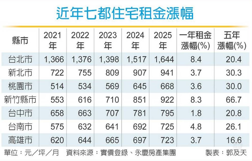 統計顯示,自2021年以來,七都住宅租金單價普遍有2成以上漲幅,其中新竹五年漲幅達66.7%。