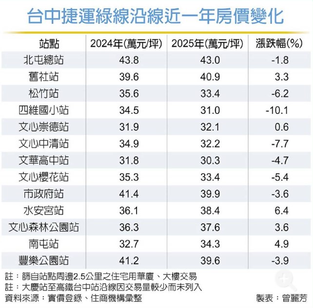 台中捷運綠線4月即將通車滿五年,房仲業者統計實登資料發現,沿線各站周邊房價出現明顯分化,即使位處市區核心的蛋黃地段,也呈現「跌多於漲」的情況,僅有少數站點維持逆勢抗跌。