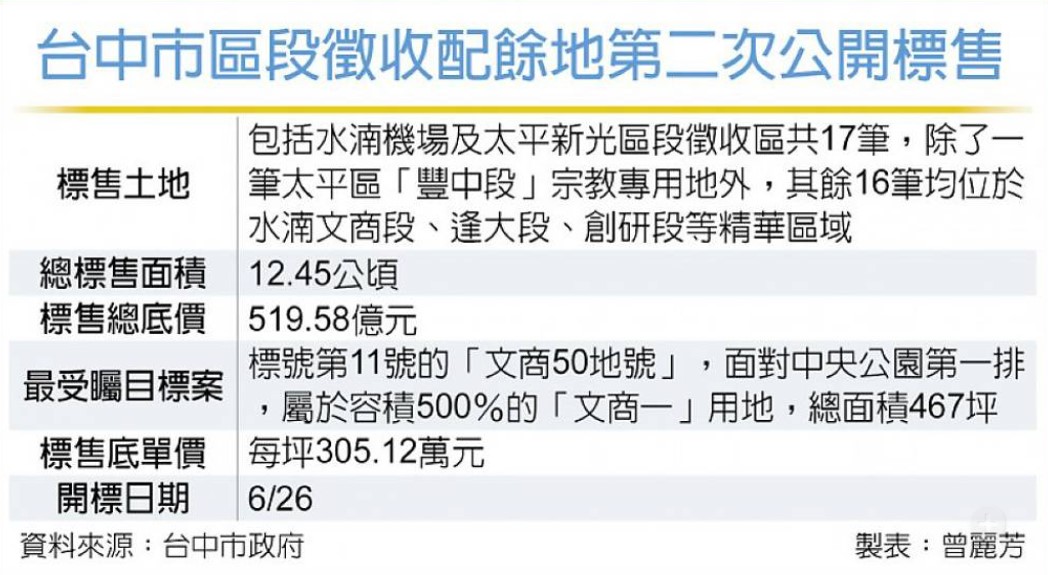 其中文商50地號面對中央公園第一排,屬於容積500%的「文商一」用地,面積475坪、每坪底價305.12萬元,總底價近14.5億元,成此次標售案焦點。