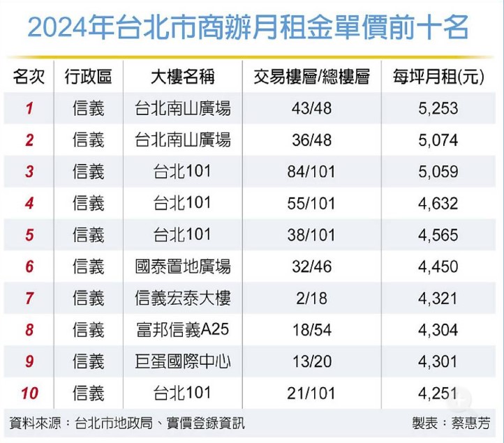 台北市地政局16日公布2024年不動產市場動態年報,台北市商辦及廠辦月租金單價前十強中,信義商圈囊括九件最強,前三名每坪月租都已突破5,000元大關,「台北南山廣場」包辦榜首及第二名,每坪月租金分別達5,253、5,074元;以及排名第三的是「台北101」,每坪月租5,059元。