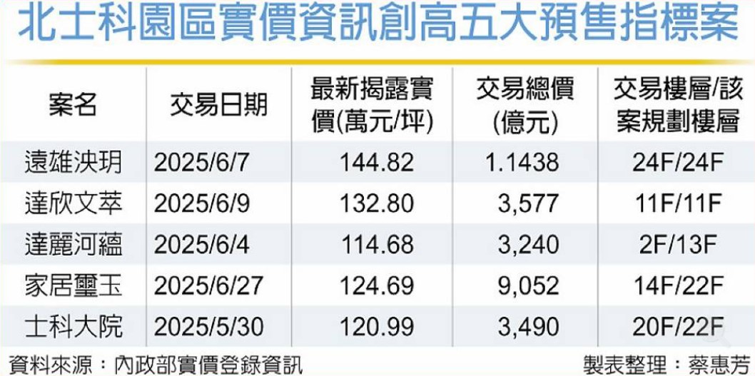 輝達台灣星群戰艦總部決定落腳北士科園區,點火周邊房市利多,據最新實價登錄資訊顯示,區內預售建案「遠雄泱玥」24樓頂樓戶以每坪144.82萬元成交,一舉超越「力麒天沐」的144.41萬元,成為北投最高單價新樓王。該區預遠雄泱玥、達欣文萃、達麗河蘊、士科大院、家居璽玉等五大預售指標案,成交單價都刷新前高。