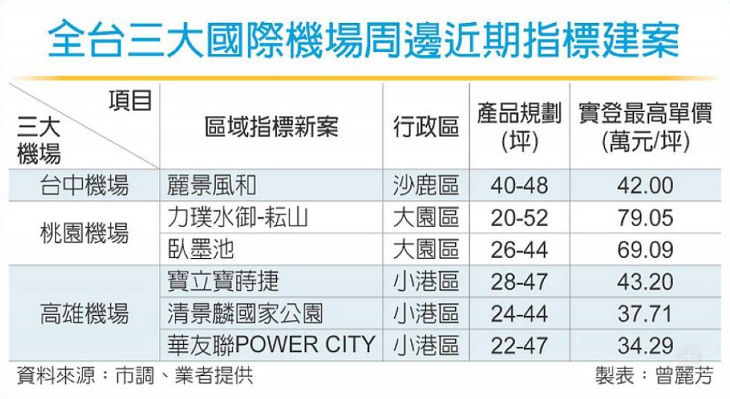 近期全台航空城生活圈建商推案熱度不減,包括桃園國際機場所在的大園區,有「力璞水御-耘山」、「臥墨池」新案;台中國際機場所在的沙鹿區,則有指標新案「麗景風和」;高雄小港國際機場所在的小港區,包括「寶立寶蒔捷」、「清景麟國家公園」、「華友聯POWER CITY」等指標建案,均以航空城題材吸引置產族關注。