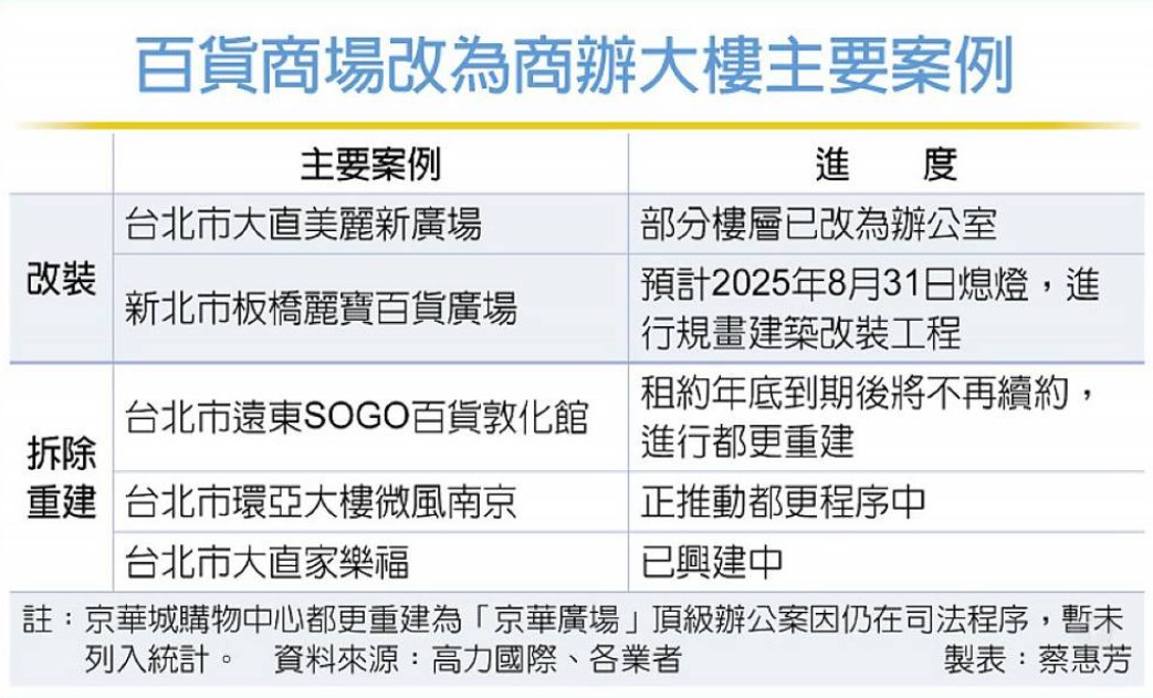 據調查,過去百貨大樓改裝為辦公的案例較少,僅北市大直美麗新廣場的樓上部分樓層改裝為辦公大樓。不過百貨大樓整棟進行都更危老,則已有不少案例,包括SOGO台北敦化館,及南京東路、敦化北路口的環亞大樓(微風南京百貨)等;大陸建設子公司萬國商業開發大直家樂福,也正重建為辦公大樓等。
