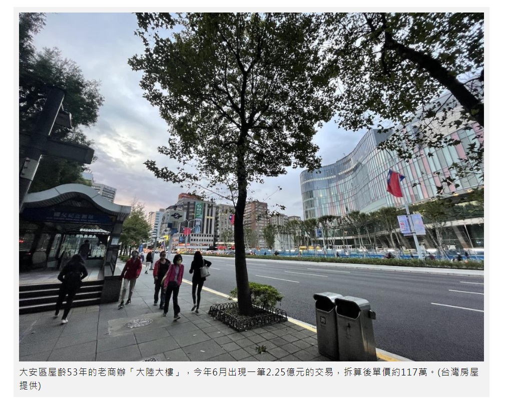 商辦越老越值錢,根據實價登錄最新資料,大安區忠孝東路四段屋齡已高達53年的老商辦「大陸大樓」,今年6月出現一筆2.25億元的交易,包含一個車位,共202.62坪,未拆車位單價111.1萬元,若車位以400萬計算,拆算後單價約117萬。