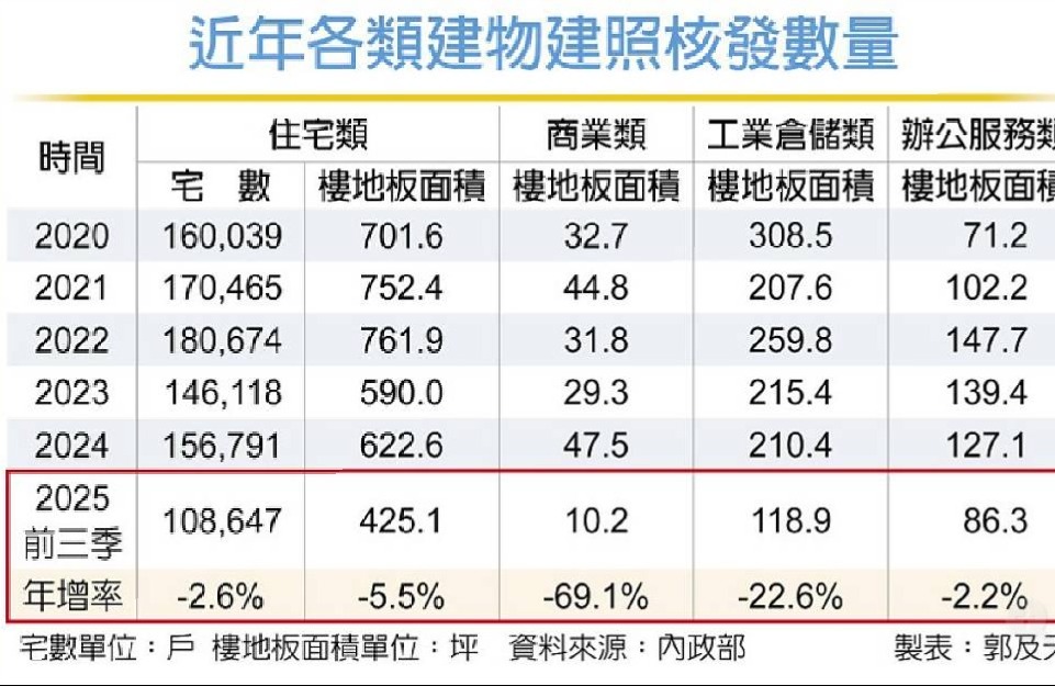 四大類建照核發面積 前三季均衰退