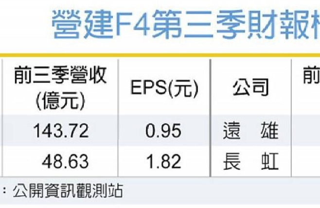 營建F4 前三季獲利下滑