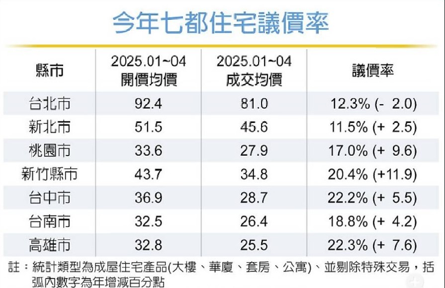 七都住宅議價率 新竹、台中、高雄突破20%