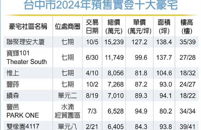 2024台中十大預售豪宅 七期奪前四 由「聯聚理安大廈」搶下第一,每坪最高成交價衝破120萬元