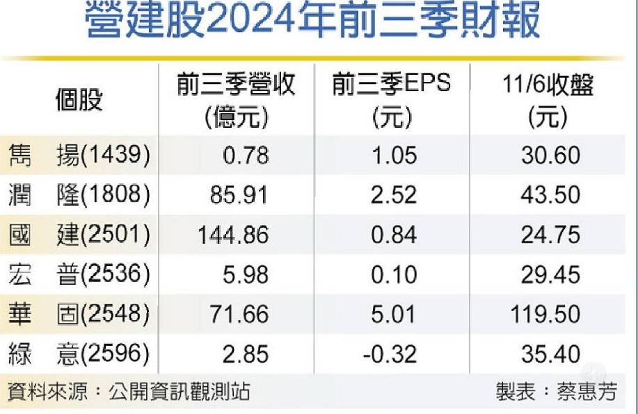 華固前三季大賺半個股本 國建、宏普獲利成長;雋揚、潤隆、綠意衰退