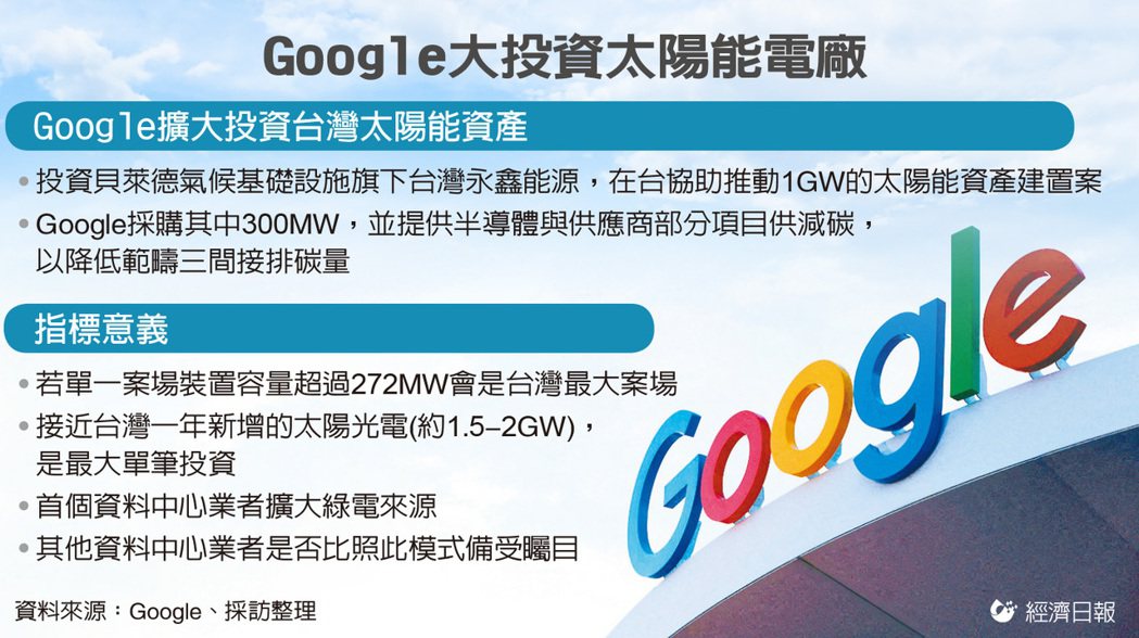 Google投資台灣太陽能推動1GW建置案 微軟、AWS等可能跟進