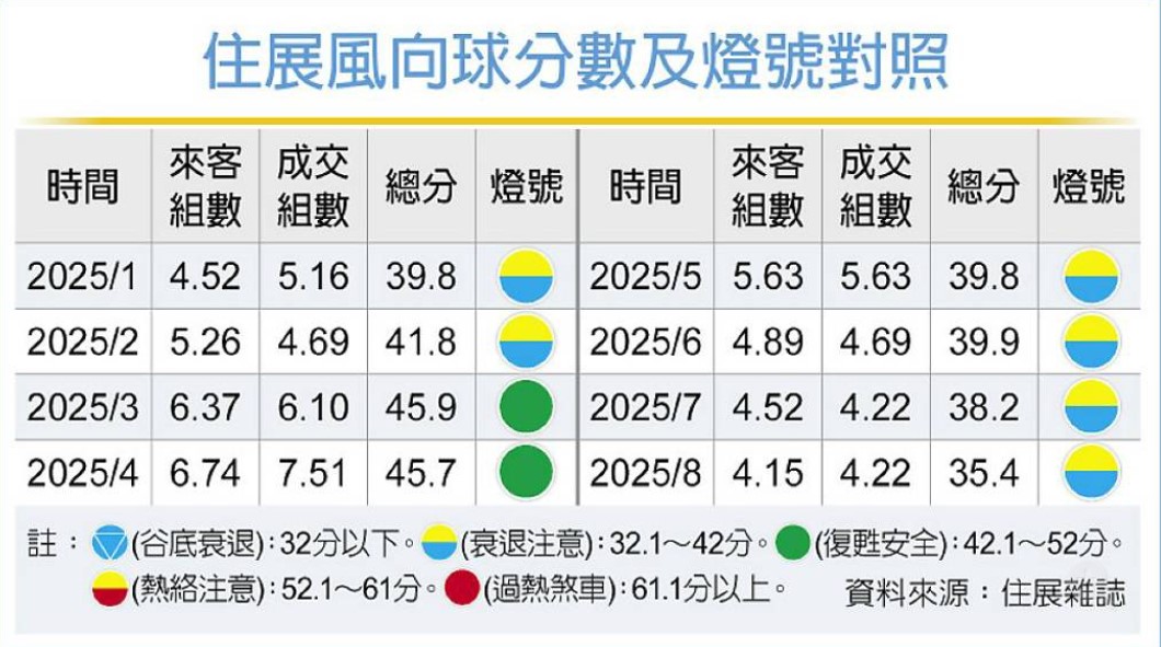 《住展雜誌》11日公布8月「住展風向球」,亮出今年以來的第六顆象徵衰退的黃藍燈,分數35.4分更是近四年最差。住展發言人陳炳辰分析,美國關稅政策正式上路,8月底更進入民俗月,近期的新青安、換屋切結期延長等利多,都在9月後宣布,因此8月利空氛圍揮之不去,資金沒有前進房地產條件。