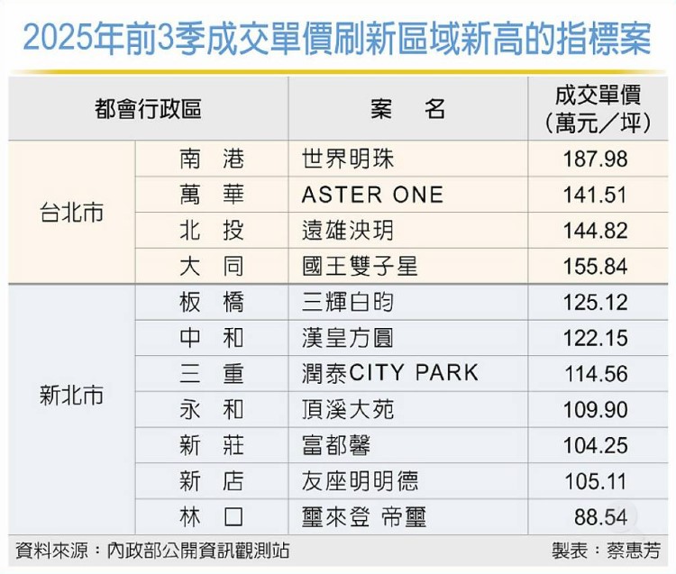 今年以來,雙北市至少有15個行政區成交單價再度改寫前高,且蛋白區甚至緊追蛋黃區。南港世界明珠每坪最高單價達187.98萬元,再破前高;遠雄泱玥每坪達144.82萬元改寫北投新高;國王雙子星155.84萬元、ASTER ONE達141.51萬元,分別突破大同、萬華區新高,也直逼信義、松山、中正等蛋黃區。