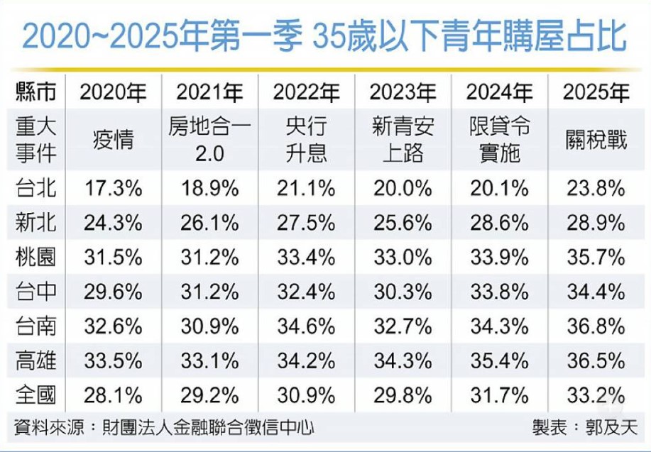 根據聯徵中心統計顯示,近年全台35歲以下的購屋族占比多在3成左右,2023年降至29.8%,而2023年8月政府加碼推出新青安政策,帶動年輕人購屋貸款比例逐年攀升,2025年第一季來到近年的高點,達33.2%,年輕人積極進場購屋。