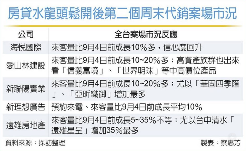 新理想廣告執行長黃正忠指出,近日政府陸續釋出鬆開首購和首換房貸水龍頭的政策善意,上周來客量已比新青安水龍頭小幅打開前增加1成多,預期房市谷底已出現。