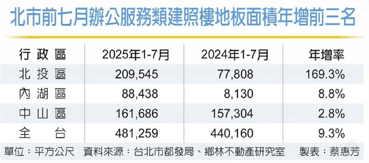 受惠AI產業擴張、輝達將進駐北士科等題材激勵,台北市商辦市場需求持續升溫。據台北市都發局統計,今年前七月辦公服務類建照核發樓地板面積達14.6萬坪、年增9.3%,其中年增率冠軍為北投區,達169.3%,「超車」內湖、中山區,躍居為商辦商圈新熱點。