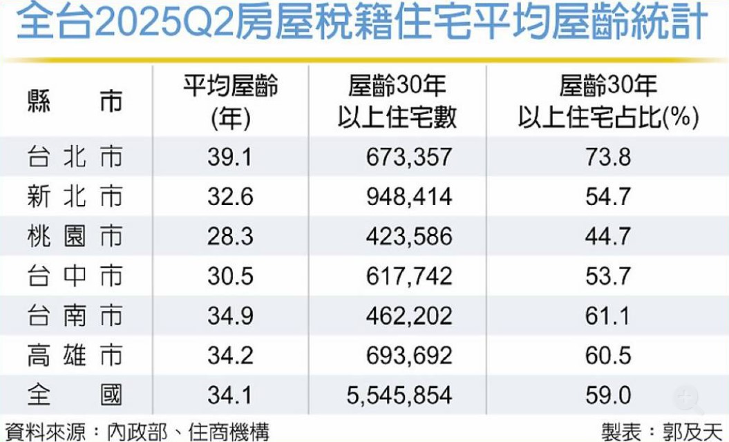 統計顯示,全台各縣市中除澎、雲林、嘉義縣平均屋齡超過40年,台北市39.1年,此外如南投、屏東、台東、花蓮等縣市也都逼近39年,全台房屋最年輕的是桃園市28.3年,全台也僅有桃園、新竹縣市及金門縣四個縣市平均未及30年。