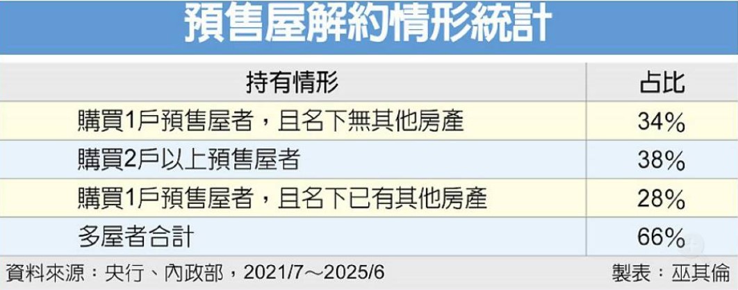 根據統計,解約案買受人購買2戶以上預售屋者占解約人數的38%,購買1戶預售屋者名下已有其他房屋占解約人數的28%,合計多屋者占比達到66%,顯示解約大多非屬自住需求者。