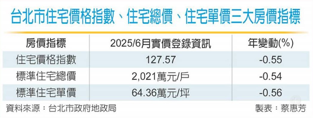 北市地政局22日公布6月「實價登錄價量動態」指出,6月住宅價格指數127.57、月跌0.38%,創下近14個月最低紀錄,回到去年4月水準,年跌幅約0.55%;標準住宅總價方面,平均每戶約2,021萬元、跌至近14個月最低量;至於標準住宅單價,每坪64.36萬元、跌至近12月新低,三大價格指標都同步衰退。