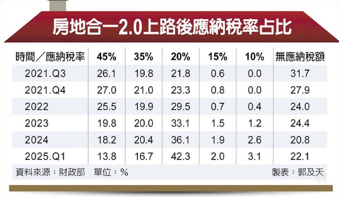 房地合一稅2.0政策上路四年後,對抑制房產短期炒作交易發揮成效。據財政部統計,房產交易中,持有2年內(須課45%稅率)、持有2~5年(須課35%稅率)的占比大減,兩者合計占比從新制剛上路時的48%,迄今已降至30.5%。