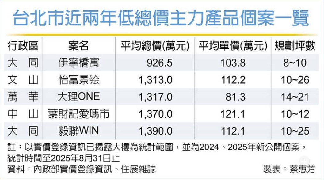 依台北市近兩年實價登錄資訊觀察,低總價新案,只有5筆新案。以文山「怡富景繪」、萬華「大理 ONE」、中山「葉財記愛瑪市」,和大同「毅聯 WIN」等4筆來說,平均每戶總價約1,300多萬元;至於符合新青安首購族總價產品只有1筆,為大同小套房宅「伊寧橋寓」,平均交易總價為926.5萬元。