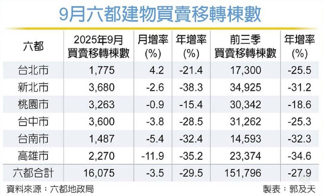 根據六都地政局統計顯示,9月除台北市月增4.2%外,其餘各都均較8月衰退;與去年同期相較,新北、台南、高雄衰退幅度均達3成以上。房仲業者指出,房市持續低迷,房貸緊縮現況、對後市信心不足趨勢,短期難以扭轉,買氣很難在短期明顯回溫。
