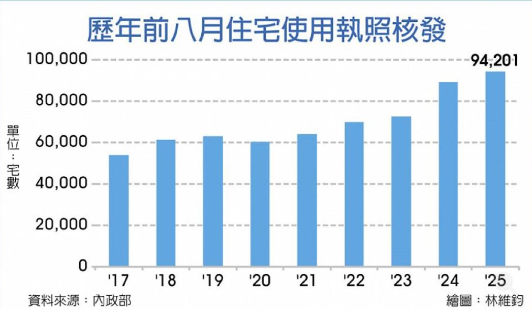 即便房市低迷,但新建案交屋海嘯仍持續堆疊。據內政部最新統計,今年1月至8月累計住宅使用執照核發數量高達94,201宅,不僅連續兩年創下同期統計新高,自2020年以來已連續五年攀升,主要受惠過去大量預售建案陸續完工;不過,今年1月至8月核發的住宅建築執照數量則創下近五年同期低點,反映當前市場前景不明、開發商趨向縮手觀望。