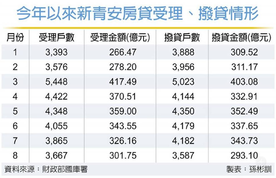 觀察今年以來新青安受理戶數上,3月來到今年以來目前最高的5,448戶,之後則是逐月下滑,8月則是降至僅剩3,667戶。不過,9月公布新政策後,各銀行目前的情形出現詢問案增加、實際承作持平或稍減,最大差別在於「撥款速度加快」,目前約縮短撥貸排程時間0.5個月左右。