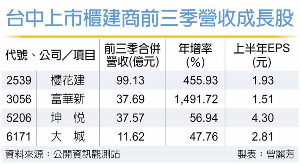 台中營建股業績靚,富華新(3056)前三季營收三級跳,櫻花建(2539)甚至近逼百億元大關,坤悅(5206)、大城(6171)年增4至5成,表現不俗。隨著第四季進入交屋旺季,法人尤其看好櫻花建、坤悅,2025全年營收與獲利創高可期。